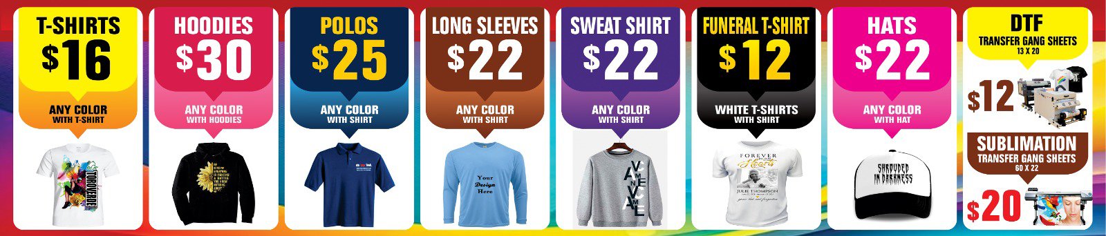 Yes! For many items (especially banners, posters, signage), we offer same‑day turnaround — as long as your art is print-ready and we have materials. For apparel, rush jobs may be possible depending on workload.